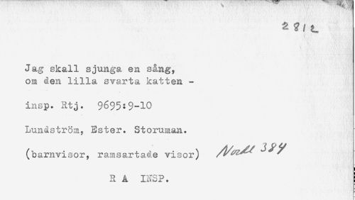 //// a L //// Jag skall sjunga, en sång, //// om den lilla svarta katten - //// insp. Rtj. 9695:$-10 //// Lundström, Ester. Storuman. //// (barnvisor, rarasartade visor) ^^^ //// R A INSP. ////