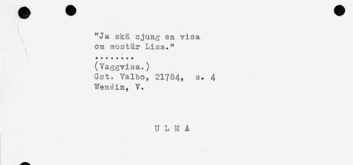 //// Hy ^ //// \ "Ja ska sjung en visa //// . - i . //// \ om mostär Lisa." //// . # . //// - ^ //// (Vaggvisa.) //// Gst. Valbo, 21784, s. 4 //// Wendin, V. //// U L M A //// t ////