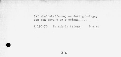 //// Ja' ska' skaffa mej en doktig kvinga, //// som kan väva o sy o spinna .... //// A 190:70 En åoktig kvinga. 6 str. //// R A ////