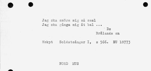 //// Jag ska snöra mig så smal //// Ja,g ska gånga mig åt bal ... //// ! ^ ^ Ds //// Brålanda sn //// Mskpt Soldatsånger I, s 566. EU 18773 //// * //// NORD MUS ////