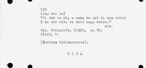 //// 120 //// (Jag ska ta) //// . * //// "Ja skä ta mig e maka ho skå bi nin tröst //// å ho skå vila ve mitt unga bröst." //// etc. //// Dal. Grangårde, 11482, s. 70. //// ^ Blixt, 0." //// (Enstaka kärleksvisor). //// U L H A ////