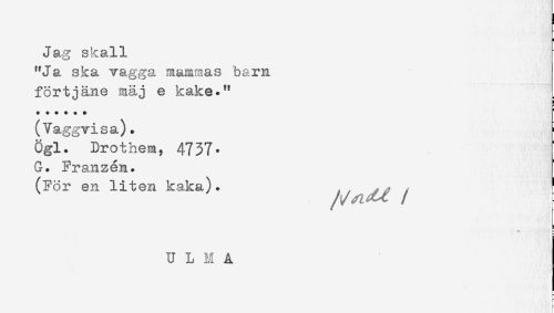 //// Jag skall //// "Ja ska vagga mammas barn //// förtjäne mäj e kake." //// . //// (Vaggvisa). //// Ögl. Drothem, 4737. //// G. Franzén. //// (För en liten kaka). , , ^ , //// U L M A ////