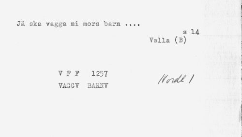 //// Jä ska vagga mi mors barn .... //// s 14 //// Valla (B) //// f //// v ^ A^/ //// VAGGV BARI^V ! //// t //// j ////