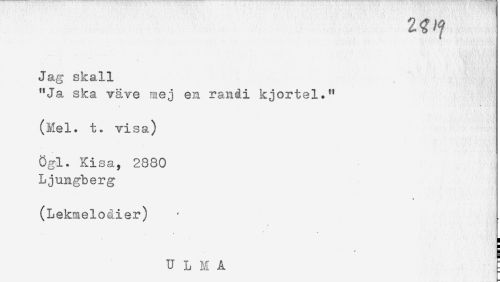 //// Jag skall //// "Ja ska väve mej en randi kjortel." //// (Hel. t. visa) //// ögl. Kisa, 2880 //// Ljungberg //// i //// (Lekmeloåier) //// : //// H //// u L M A ' ////