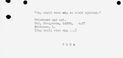 //// "Jag skall väva mig en randi kjortel." //// Polsktext med mel. //// Dal, Grangårde? 14900^ s.97 //// Eriksson, L. //// (Jag skall väva mig ...) //// U L M A ////