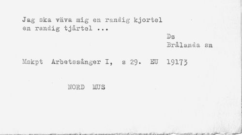 //// Jag ska väva mig en randig kjortel //// en randig tj&rtel ... //// Ds //// Brålanda sn //// Mskpt Arbetssånger s 29. EU 19173 //// NORD MUS ////