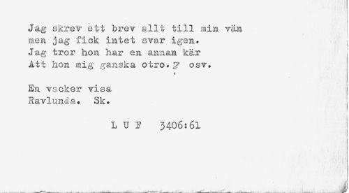 //// Jag skrev ett brev allt till min vän //// men jag fick intet svar igen. //// Jag tror hon har en annan kär //// Att hon mig ganska otro.y osv. //// i //// En vacker visa //// Ravlunda. Sk. //// L U F 3406:61 i ////