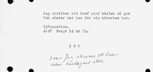 //// Jag skrifver ett bref utaf kärlek sa god //// Och sänder det hem där min kärestan bor. //// Sjömansvisa. //// 4:4? Brage 14 nr 22. //// ÅBO ////
