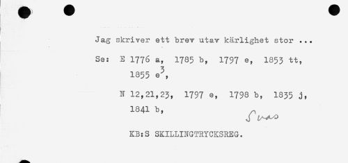 //// . — - - ......- .. .. i ... . //// Jag skriver ett brev utav kärlighet stor ... //// Se: E 1776 a, I785 b, 1797 e, 1853 tt, //// 1855 e^, //// N 12,21,23, 1797 e, 1798 b, 1835 j, //// 1841 b, ^ //// KB:S SKILLINGTRYCKSREG. ////