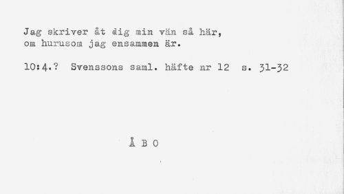 //// Jag skriver åt dig min vän så här, //// om hurusom jag ensammen är. //// 10:4*? Svenssons saml. häfte nr 12 s. 31*32 //// < //// . i //// . //// ÅBO //// -j //// ! ////