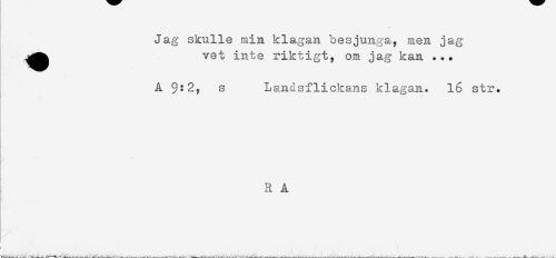 //// Jag skulle min klagan besjunga, men jag //// vet inte riktigt, om jag kan ... //// Å $:2, s Landsflickans klagan. 16 str. //// ! //// R A //// H ////