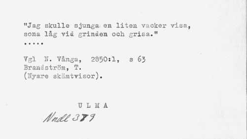 //// "Jag skulle sjunga en liten vacker visa, //// sona låg vid grinden och grisa." //// ***** //// Vgl N. Y&nga, 2850:1, s 63 //// Brandström, T. //// (Nyare skämtvisor). //// U L M A ////