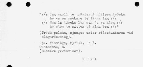 //// ":/: Jag skull te prästen å hjälpen tröska //// he va en rackare te lägga lag :/: //// :/: Han la tjocka lag men ja va klen :/: //// he stog te mitten p& mina hen :/:" //// (Trösk-polska, sjunges under vilostunderna vid //// slagtröskning). //// ; Upl. Vittinge, 2372:1, s 6. //// Gustafson, E. //// (Enstaka yrkesvisor). //// U L n A ////