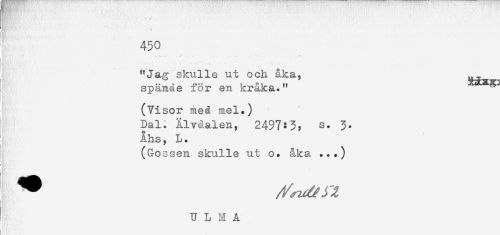 //// - //// 450 //// . .- ... __ * //// .'* .. . ' ' *-* ** ' '* ' * : //// "Jag skulle ut och åka, ^ //// spände för en kråka." ^ //// (Visor med mel.) //// Dal. Älvdalen, 2497:3? s. 3. //// Åhs, L. //// (Gossen skulle ut o. åka ...) //// i //// . //// U L M A ////