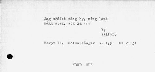 //// i .', ' 't //// Jag sk&åat iR&Rg by, mång land //// m&ng stad, ack ja ... //// Yg //// Valtorp //// i * * //// Mskpt II. Soldat sånger s. 179. EU 21131 //// i . t //// ! //// NORD MUS ////