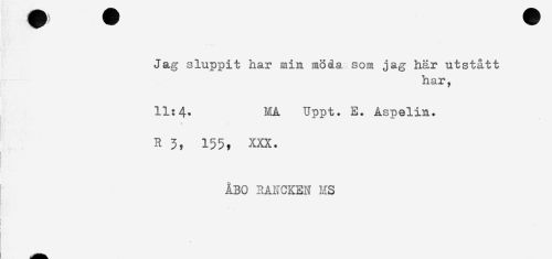 //// Jag sluppit har min möda som jag hår utstått //// har, //// 11:4* MA Uppt* E. Aspelin. //// ^ v //// R 3, 155, XXX. //// i //// ÅBO RANCKEN MS ////