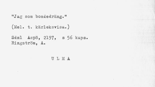//// "Jag som bonåedräng." //// (Mel. t. kärleksvisa.) //// Sdml Aspö, 2197 y s 56 kaps. //// Ringström, A. //// U L M A ////