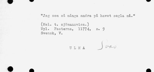 //// "Jag som så många andra på havet segla må." //// (Mel. t. sjömansvisa.) //// Upl. Fastema, 11774? s. 9 //// Svensk, V. //// U L K A - ////