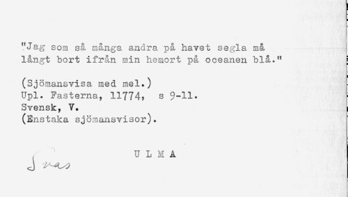 //// "Jag som så många andra på havet segla må //// långt bort ifrån min hemort på oceanen blå." //// (Sjömansvisa med mel.) //// Upl. Fasterna, 11774, s $-11. //// Svensk, V. //// (Enstaka sjömansvisor). //// U L M A ////