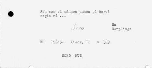 //// i //// j //// ^^ Jag som så mången annan på havet //// ^^ segla må ... //// Ha //// v' ^ Har pl inge //// EU 15643. Visor, II s. 509 //// ! //// NORD MUS ////