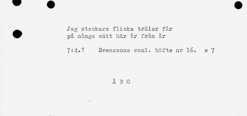 //// ^^ Jag stackars flicka trålar får //// på många sätt här år från år //// 7:4.? Svenssons saml. häfte nr 16. s 7 //// ÅBO ////