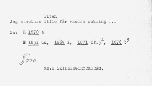 //// ... t //// liten //// Jag stackars lille f&r vandra omkring ... //// Ses R 1870 a //// E 1851 un, 1869 i, 1871 ff,A 1876 b^ //// HB:S SKILLINGTRYCKSREG. ////
