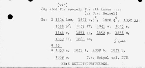 //// (vid) //// Jag stod för spegeln för att kamma .... //// __(av C.v. Zeipel) //// * Se: E 1824 icc, 1827 1828 q\ 1352 jj, //// 1855 1837 ff, 1841 a, 1843 v, //// 1848 v, 1851 qq, 1852 p, 1856 c, //// 1859 11, 1868 mm, r //// & 48 //// N 18^0 a. 1855 1, 1859 b, 1847 b. //// 1869 e, C.v. Zeipel enl. LUB //// KB:S SKILLINGTRYCKSREG. ////