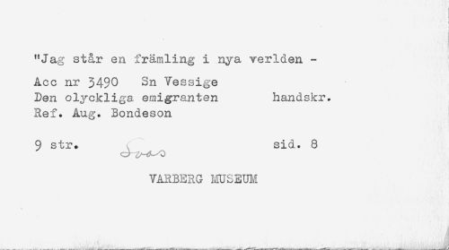 //// "Jag står en främling i nya verlden - //// Acc nr 3490 Sn Vessige //// Den olyckliga emigranten handskr. //// Ref. Aug. Bondeson //// 9 str. sid. 8 //// VARBERG HUSEUn ////
