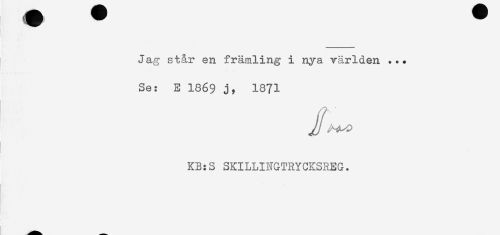 //// Jag står en främling i nya världen ... //// Se: E 1869 j, 1871 //// I //// KB:S SKILLINGTRYCKSREG. ////