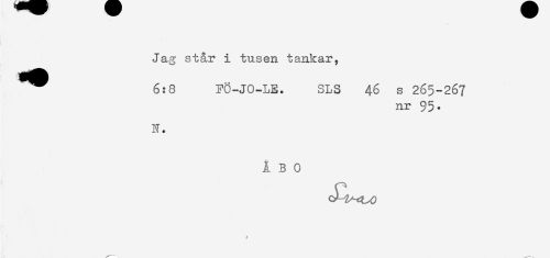 //// Jag st&r i tusen tankar, //// ^ 6:8 FÖ-JO-LE. SLS 46 s 265-267 //// nr $5. //// N. //// ÅBO ////