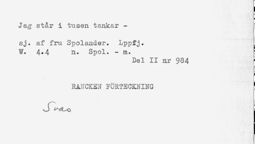 //// Jag står i tusen tankar - //// sj. af fru Spolander. Lppf j. , //// W. 4*4 n* Spol. - m. //// Del II nr 984 //// RANCKEN FORTECKNING //// j ////
