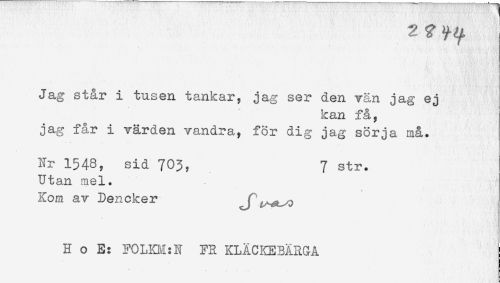 //// 2 ? y //// Jag står i tusen tankar, jag ser den vän jag ej //// kan få, //// jag får i värden vandra, för dig jag sörja må. //// Nr 1548, sid 703, 7 str. //// Utan mel. //// Kom av Den eker j j //// H o E: FOLKM:N FR KLÄCKEBÄRGÅ ////