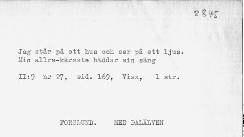 //// Jag står på ett hus och ser på ett ljus. //// Min allra-käraste bäddar sin säng //// 11:9 nr 27, sid. 169? Visa, 1 str. //// FORSLUND. MED DALALVEN ! //// < ////