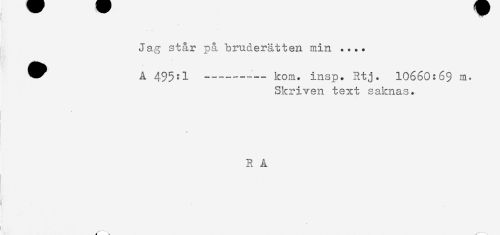 //// Jag står på, bruderätten min .... //// ^ A 495*1 --kom. insp. Rtj. 10660:69 m. //// Skriven text saknas. //// R A //// * ////