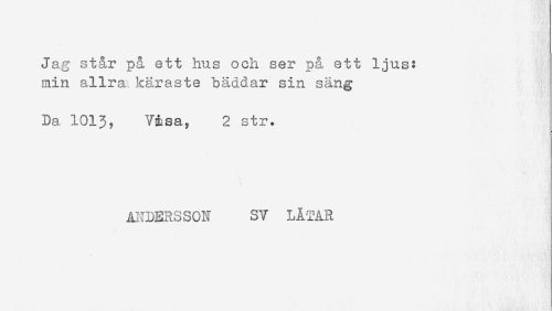 //// Jag står på ett hus och ser på ett ljus: //// min allra.käraste bäddar sin sang //// Da 1013, Visa, 2 str. //// ANDERSSON SV LÅTAR ////