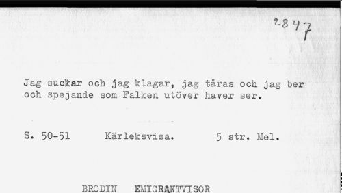 //// Vj? //// Jag suckar och jag klagar, jag tåras och jag ber //// och spejande som Falken utöver haver ser. //// * .. .. * //// S. 50-51 Kärleksvisa. 5 str. Mel. //// BRODIN EMIGRÅNTYISOR ////