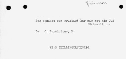 //// (yryi ^ * //// # # < # //// Jag syndare som gruvligt har mig mot min Gud //// förbrutit ... //// Se: 0. Larsdotter, M. //// KB:S SKILLINGTRYCESREG. ////