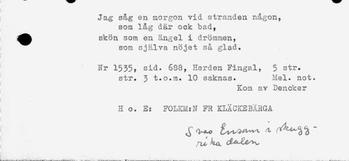 //// Jag såg en morgon vid stranden någon, //// som låg där ock bad, //// , ^^ skon som en ängel i drömmen, //// som själva nöjet så glad. //// I //// ' ' Nr 1535, sid. 688, Herden Fingal, 5 str. //// str. 3 t.o.m. 10 saknas. Mel. not. //// Kom av Deneker //// , H o. E: F0LKM:N FR KLAOHEBARGA //// I //// t^/'*' ' . - .''.H / ' <** ' < . ' ., t ** < j t ////
