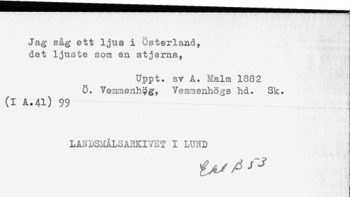 //// . ! //// i //// Jag såg ett ljus i Österland, //// det ljuste som en stjerna. //// Uppt. av A. Malm 1882 //// 0. Temmenh^g, Vemmenhögs hd. Sk. //// ——————--- //// LANDSMÅLSARKIVET I LUND ////