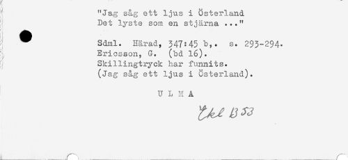 //// "Jag såg ett ljus i Österland //// Det lyste som en stjärna ..." //// i; * Sdml. Härad, 347:45 b,, s. 293-294. //// ^ Ericsson, G. (bd 16). //// Skillingtryck har funnits. //// (Jag såg ett ljus i österland). //// U L M A //// \ //// ^_______r , ______ ___ ______ . _______^ ////