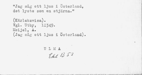 //// "Jag såg ett ljus i österland, //// det lyste som en stjärna." //// (Kärleksvisa). //// Vgl. Utby, 12349^ //// Meijel, A. //// (Jag såg ett ljus i Österland). //// + //// U L H A ////
