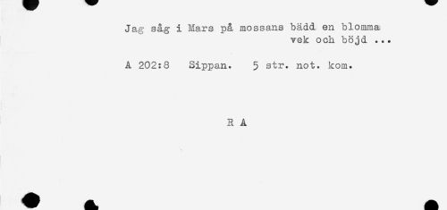 //// Jag såg i Mars på mossans bädd en blomma //// vek och böjd ... //// A 202:8 Sippan. 5 str. not. kom. //// R A ////