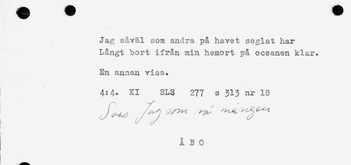 //// Jag såväl som andra på havet seglat har //// Långt bort ifrån min hemort på oceanen klar. //// En annan visa. //// ! 4:4* Kl SLS 277 s 313 nr 18 ////