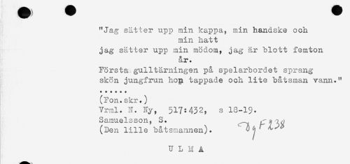 //// "Jag sätter upp min kappa, min handske och //// min hatt //// jag sätter upp min mödom, jag är blott femton //// år. //// Första,gulltärningen på spelarbordet sprang //// skön jungfrun hop tappade och lite båtsman vann." //// *+ + * + * //// (Fon.skr.) //// Vrml. N. Ny, 517:432, s 18-1$. //// Samuelsson, S. //// (Den lille båtsmannen). //// U L M A ////