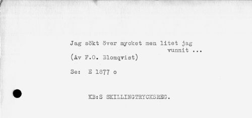 //// y ' //// i //// Jag sökt över mycket men litet jag //// vunnit ... //// (Av F.O. Blomqvist) //// Se: E 1877 o //// ^ KB:S SKILLINGTRYCKSREG. ////