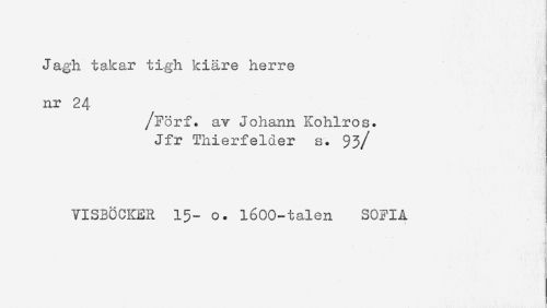 //// Jagh takar tigh kiåre herre //// nr 24 //// /Förf. av Johann Kohlros. //// Jfr Thierfelder s. 93/ //// VISBOCKER 15- o. 1600-talen SOFIA //// n ////