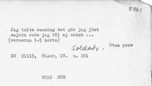 //// 2 ?é t ] //// Jag talte sanning det gör jag jämt //// majorn sade jag tål ej skämt ... //// (verserna 1-5 borta) //// EU 21119, Visor, IV. s. 201 //// NORD ms ////