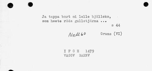 //// Ja tappa bort mi lelle bjälleko, //// som heete röda gullstjärna ... //// s 44 //// Grums (Vi) //// IFGH 1479 //// VAGGV BARNV ////