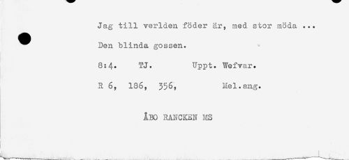 //// Jag till verlden föder år, med stor möda ... //// ^^ Den blinda gossen. //// 8:4. TJ. Uppt. Wefvar. //// R 6, 186, 356, Hel.ang. //// . //// ÅBO RANCKEN MS ////
