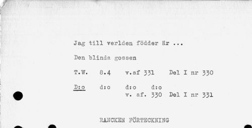 //// ) ^ //// I //// J //// - //// <.') t * < , ' ' / //// '' - . ' - - ' //// i //// - //// * //// Jag till verlden födder är ... //// Den blinda gossen //// T.W. 8.4 v.af 331 Del I nr 330 //// D:o d:o d:o d:o //// ] ^ v. af. 33O Del I nr 331 //// ! //// RANCKEN FÖRTECKNING ////
